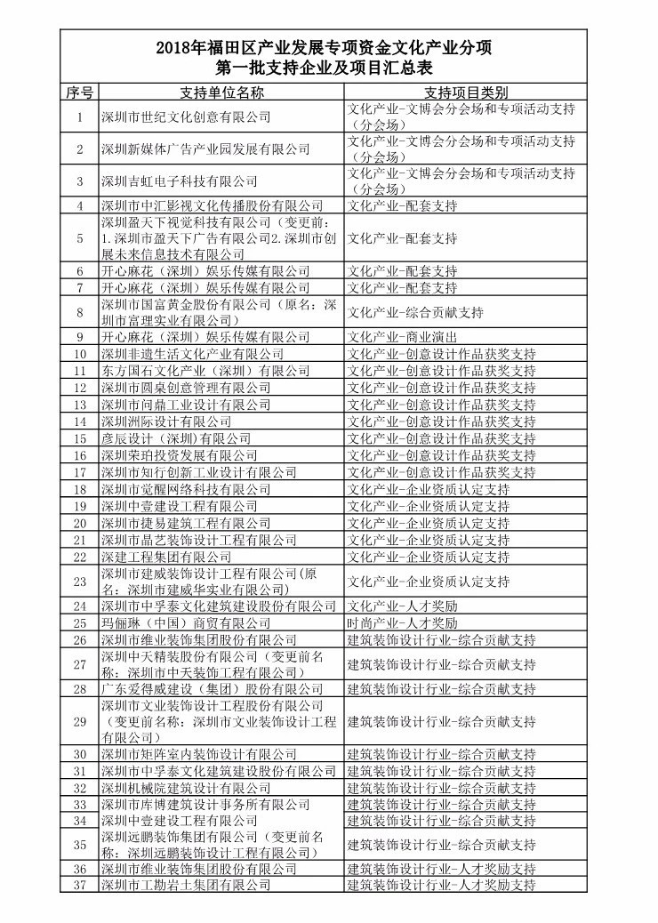 2018年福田區產業發展專項資金文化產業分項第一批支持企業及項目匯總表