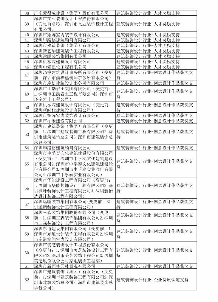 核心提示:2018年9月25日,福田企服中心公布了2018年福田區產業發展專項資金文化產業分項第一批支持企業及項目匯總表。其中,深圳中壹建設工程有限公司、深圳遠鵬裝飾集團有限公司、深圳東道建設集團有限公司等建筑裝飾企業獲得該項專項資金支持。支持項目類別有建筑裝飾設計行業——綜合貢獻支持、人才獎勵支持、創意設計作品獲獎支持、企業資質認定支持。