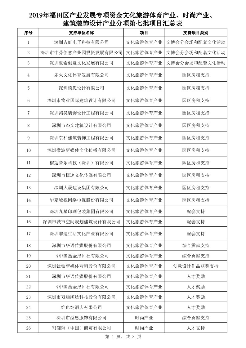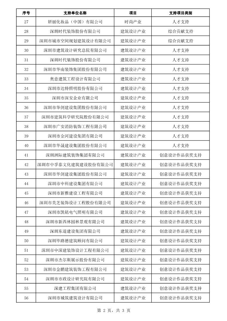 2020年3月24日,福田企服中心公布了2019年福田區(qū)產(chǎn)業(yè)發(fā)展專項(xiàng)資金文化旅游體育產(chǎn)業(yè)、時(shí)尚產(chǎn)業(yè)、建筑裝飾設(shè)計(jì)產(chǎn)業(yè)分項(xiàng)第七批支持企業(yè)及項(xiàng)目匯總表。其中,深圳市華南裝飾集團(tuán)股份有限公司、深圳市華劍建設(shè)集團(tuán)股份有限公司、深圳市廣安消防裝飾工程有限公司、深圳洲際建筑裝飾集團(tuán)有限公司等建筑裝飾設(shè)計(jì)企業(yè)獲得該項(xiàng)資金支持,支持項(xiàng)目類別有:綜合貢獻(xiàn)支持、創(chuàng)意設(shè)計(jì)作品獲獎(jiǎng)支持、人才支持、企業(yè)支持認(rèn)定支持。