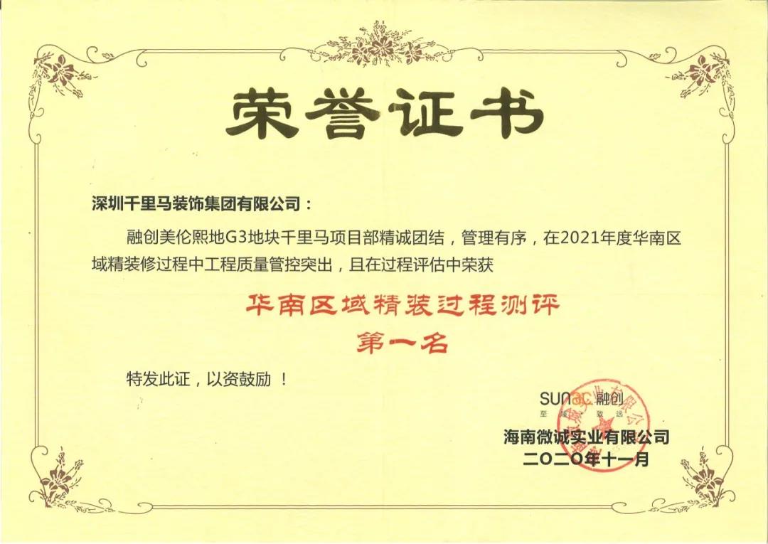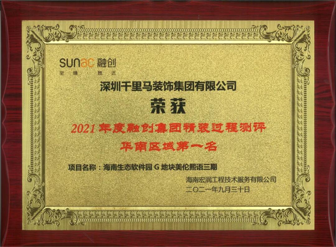 近日,千里馬裝飾位于海南省澄邁縣老城軟件園區(qū)的融創(chuàng)美倫熙語G3地塊15#、16#、20#樓項(xiàng)目憑借專業(yè)的施工、科學(xué)的管理,最終榮獲“2021年度融創(chuàng)集團(tuán)精裝過程測(cè)評(píng)華南區(qū)域第一名”的優(yōu)異成績。