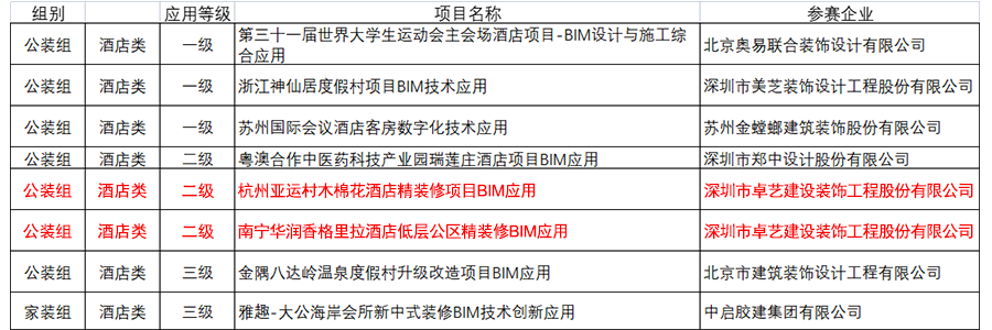 近日,由中國建筑裝飾協(xié)會舉辦的“第三屆建筑裝飾BIM大賽”公布了評審結果,卓藝裝飾承建的南寧華潤香格里拉酒店、杭州亞運村木棉花酒店兩項目獲評公裝組酒店類二級應用水平,重慶市北部新區(qū)別墅項目獲評幕墻組優(yōu)秀應用水平。