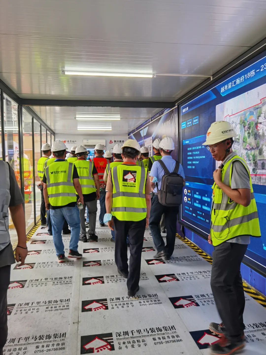 8月13日,越秀地產(chǎn)集團及區(qū)域公司在我司承建的越秀星匯瀚府項目20-23棟二次裝修項目上舉行了安全文明質量標桿工地觀摩活動。出席觀摩會的主要領導有越秀地產(chǎn)集團副總經(jīng)理王榮濤、越秀地產(chǎn)灣西區(qū)域總經(jīng)理陸文軍、越秀地產(chǎn)工管部總經(jīng)理孟慶恩、越秀地產(chǎn)安監(jiān)部總經(jīng)理凌石等一行人、總包融興建設集團韋新丹董事長,千里馬公司董事長李向東、營銷總監(jiān)時玉香、項目經(jīng)理李永生陪同參會。