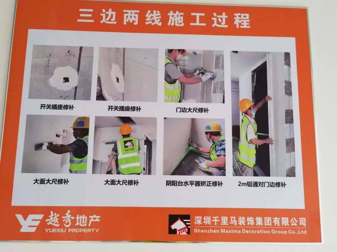 該項目重難點主要體現(xiàn)在以下幾個方面:1、衛(wèi)生間和陽臺地面瓷磚采用濕貼鋪法,能有效地防止?jié)B漏隱患,項目部針對瓷磚濕貼對工人進行了專門的技術交底,嚴格按照工序與質量要求進行施工。2、三邊兩線工藝,在涂料施工前嚴格按照三邊兩線工藝,門窗邊、柜體邊、開關面板線盒邊、門套線、踢腳線先進行膩子找平施工完成驗收后再開始大面膩子施工;按照甲方高標準要求,本項目開關面板及門套線在乳膠漆完成面漆后再安裝,保留自然縫,呈現(xiàn)較好的觀感質量。3、空調(diào)風口百葉采用細邊框,項目部與甲方進行技術溝通,優(yōu)化了空調(diào)百葉的安裝方式,視覺上隱藏了螺絲,大大提升了觀感質量,最終得到越秀地產(chǎn)集團的一致好評和認可。