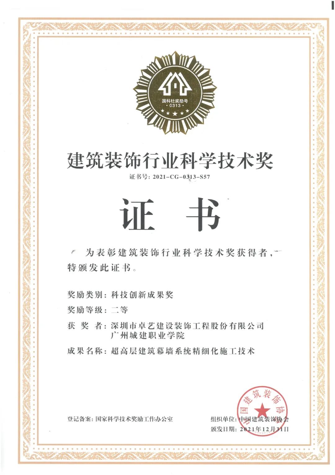 近期,“2021-2022年度中國建筑裝飾行業科學技術獎”和“2021-2022年度中國建筑工程裝飾獎”頒獎典禮在京隆重舉行,卓藝裝飾收獲頗豐,再添6項國家級獎項,包含1項“建筑裝飾行業科學技術獎”和5項“中國建筑工程裝飾獎”。