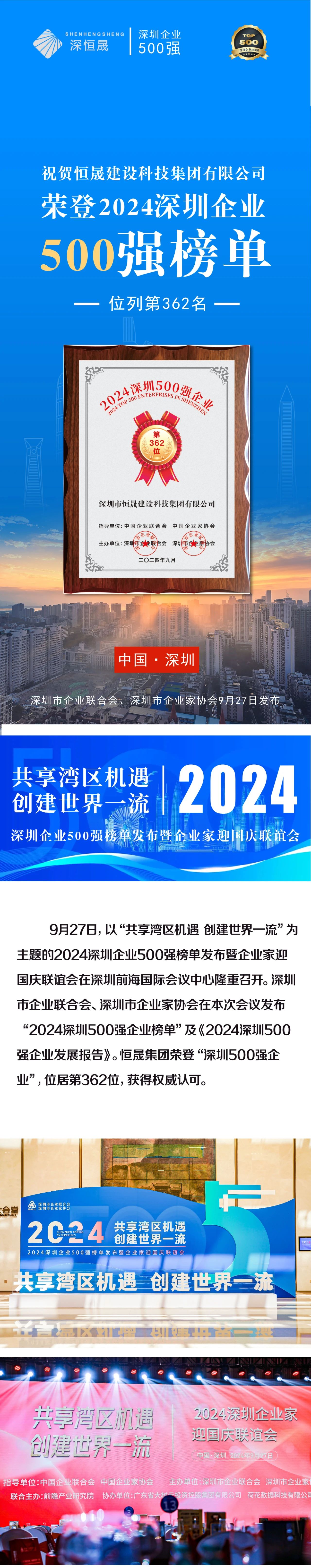 恒晟集團榮登“2024深圳企業500強榜單”