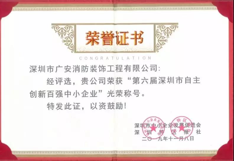 11月8日下午,以“榮耀歲月·攜手共進(jìn)”為主題的深圳市中小企業(yè)發(fā)展促進(jìn)會(huì)20周年慶典大會(huì)暨第六屆深圳市自主創(chuàng)新百強(qiáng)中小企業(yè)頒獎(jiǎng)儀式順利舉行。大會(huì)上公布了第六屆深圳市自主創(chuàng)新百強(qiáng)中小企業(yè)名單,深圳市廣安消防裝飾工程有限公司(以下稱“廣安消防”)成功入圍,位列第18名。