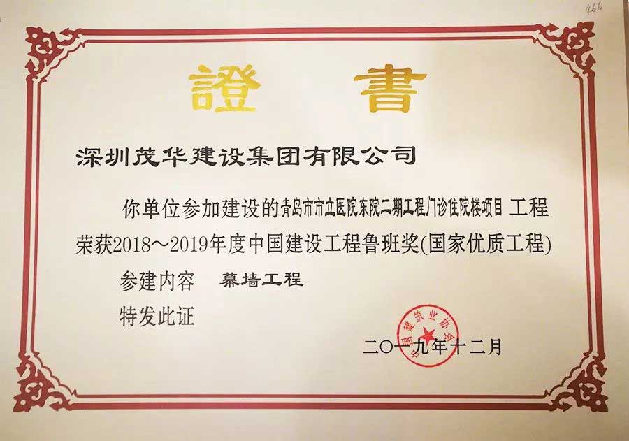 12月10日,2018——2019年度中國(guó)建設(shè)工程魯班獎(jiǎng)(國(guó)家優(yōu)質(zhì)工程)表彰大會(huì)在北京會(huì)議中心隆重舉行。深圳茂華建設(shè)集團(tuán)有限公司承建的青島市市立醫(yī)院榮獲魯班獎(jiǎng)這一殊榮。公司執(zhí)行董事劉總和青島分公司總經(jīng)理何總親臨會(huì)議現(xiàn)場(chǎng),見證了茂華發(fā)展中的重要時(shí)刻和蓬勃力量。
