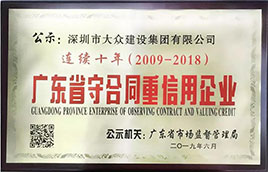 大眾建設:連續十年榮獲廣東省“守合同重信用”企業