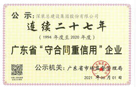 近日,廣東省市場監督管理局為廣東省社會信用體系建設進程發展作出突出貢獻的優秀企業予以表彰公示。深裝總建設集團股份有限公司(以下稱“深裝總”)榜上有名,榮獲2020年度廣東省“守合同重信用”企業稱號,這是深裝總連續27年獲此殊榮。
