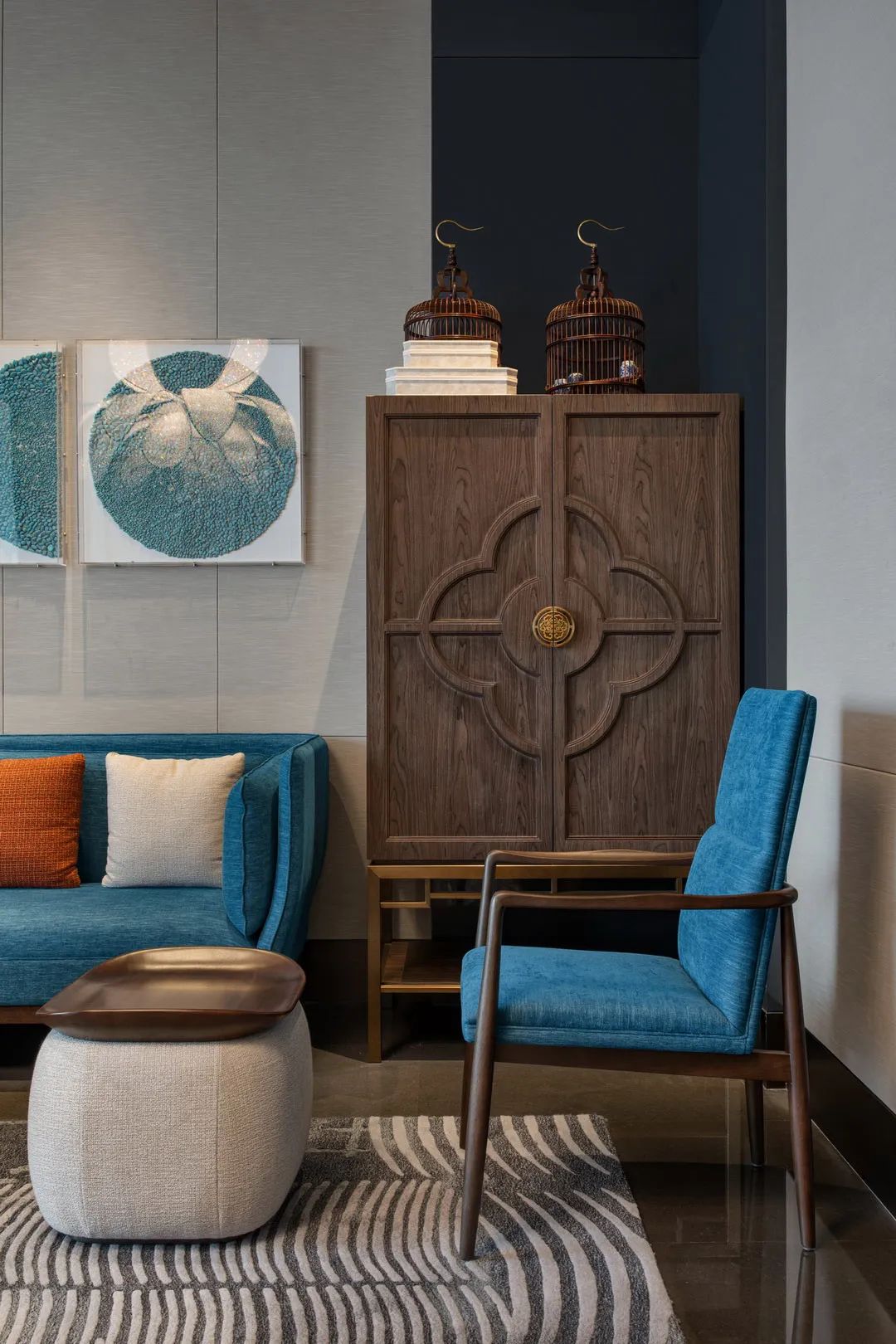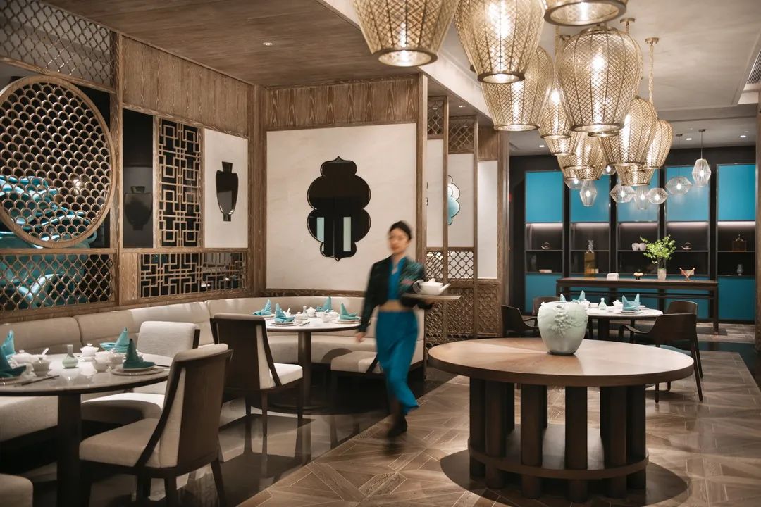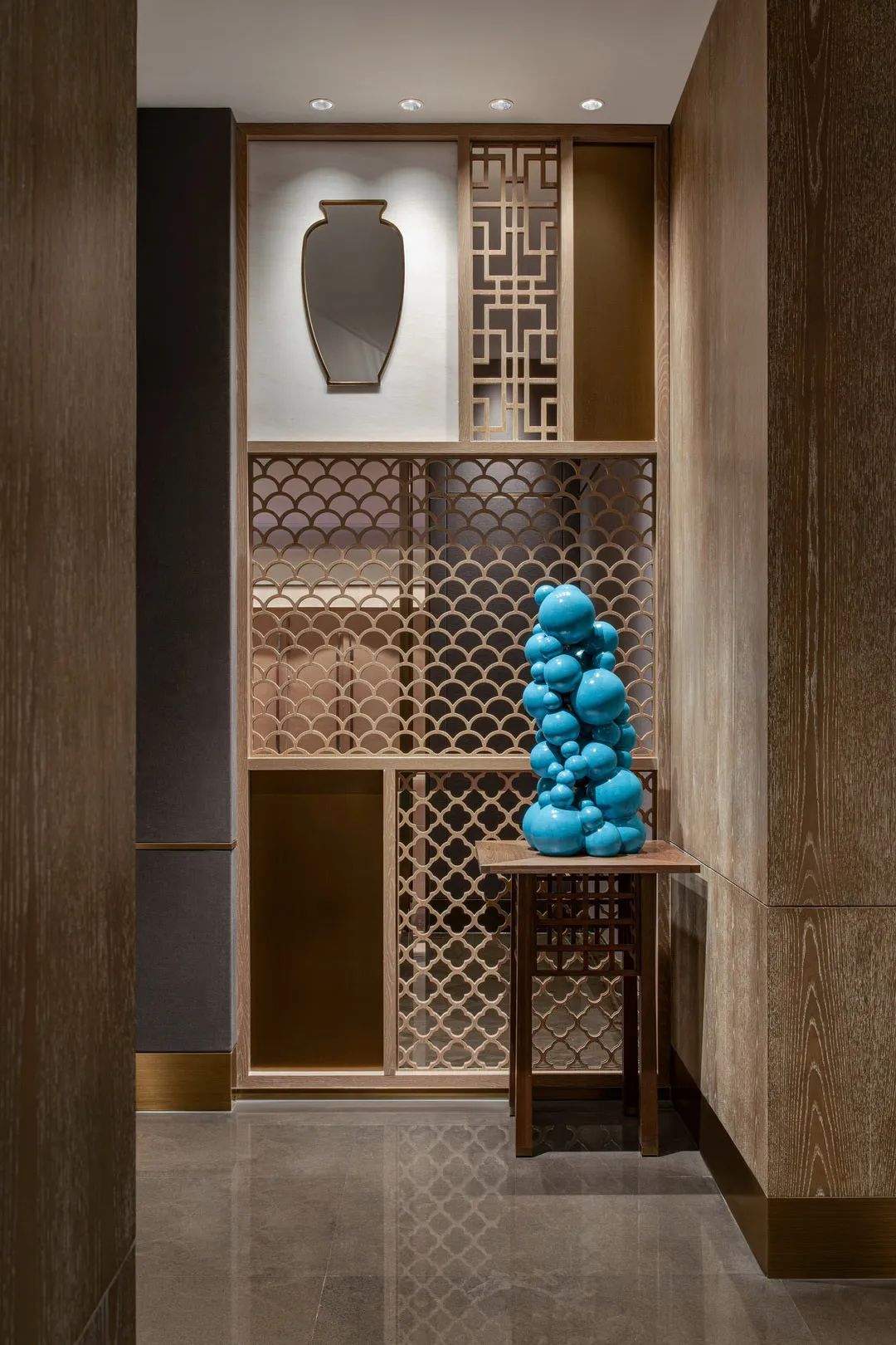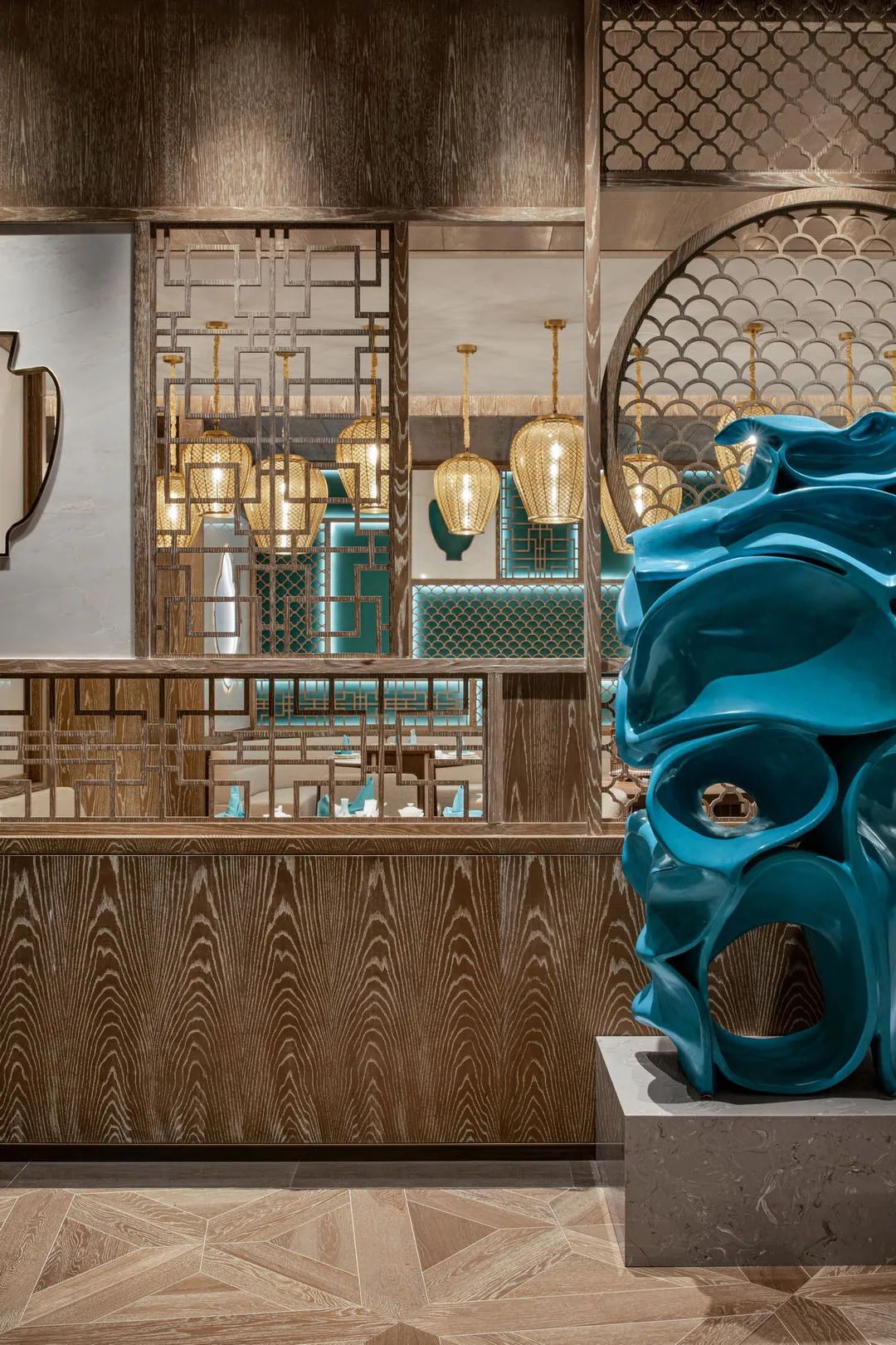 裸露的深棕原木紋理,由墻鋪展桌椅、邊柜、花窗,精心設計的燈光或隱或現,令人倍感溫潤與親密。高瓷藍點綴流線雕塑、黃銅把手及布藝沙發;松石綠暈染如玉燈光壁、星砂裝飾畫……幽暗氛圍中,雙色交相輝映,如千里江山圖里的只此青綠,韻味無窮。