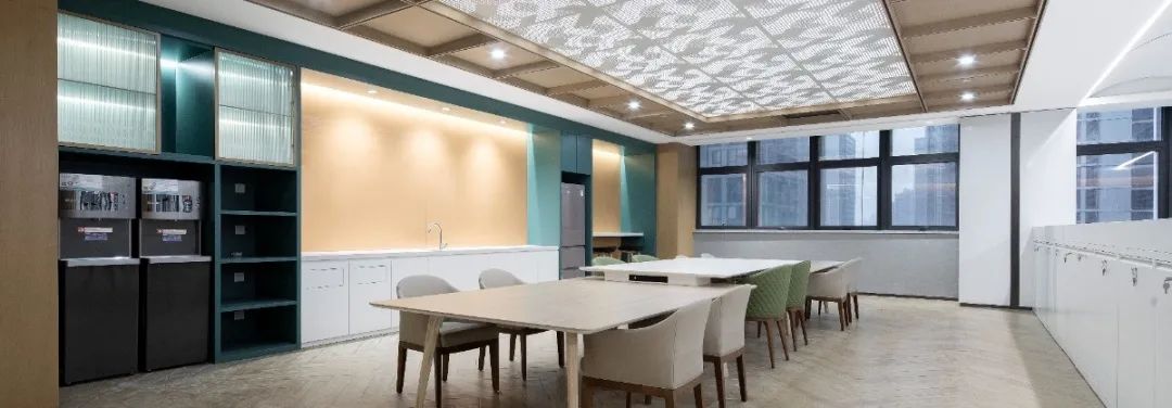 休息區、茶水間的整體視覺由大色塊拼合而成,莫蘭迪色系墻面過渡自然,呈現大氣而純粹的精致美感;地面木紋磚則采用人字型鋪貼,錯落有致的排列讓木地板更加靈巧生動,使空間更富延展性。