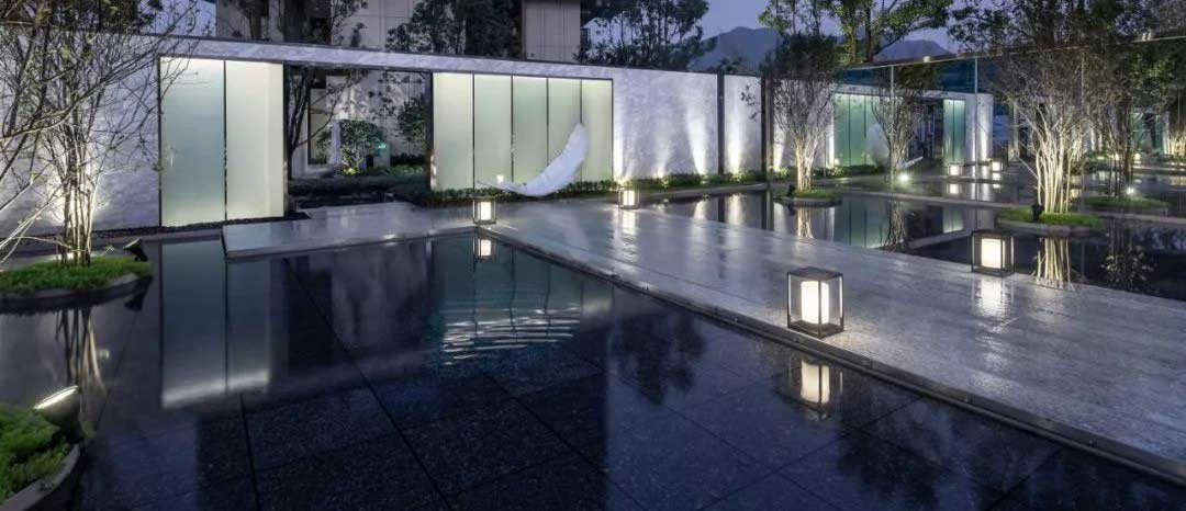 入口運用鏡面水景與鏡面景墻相互碰撞、相互融合產生以小見大,無界大海與遼闊山野,一望無際的畫面。