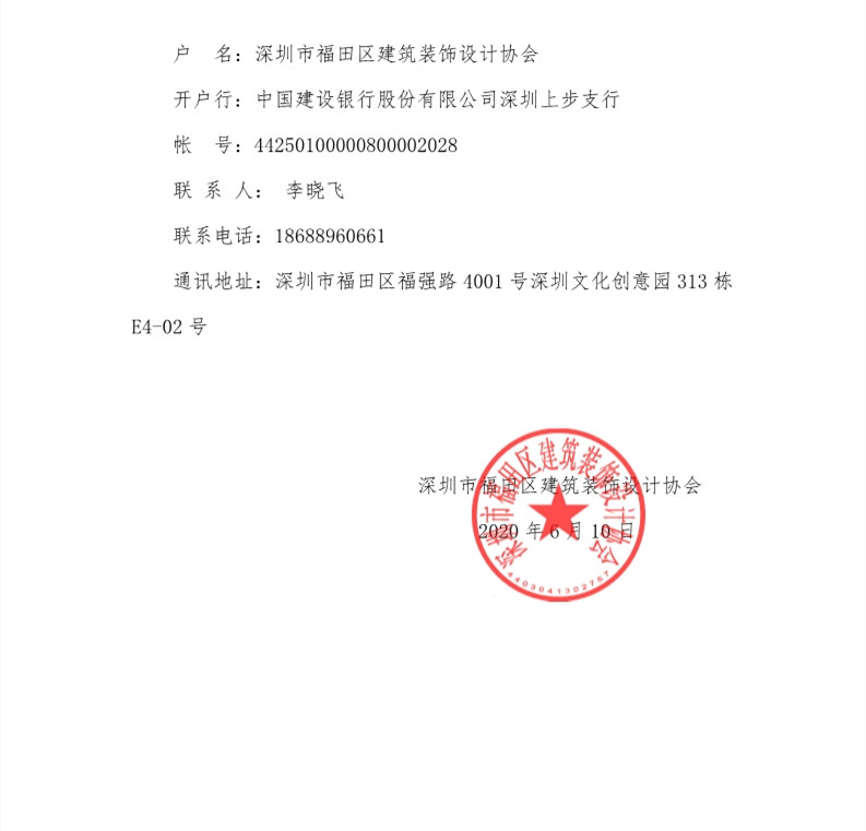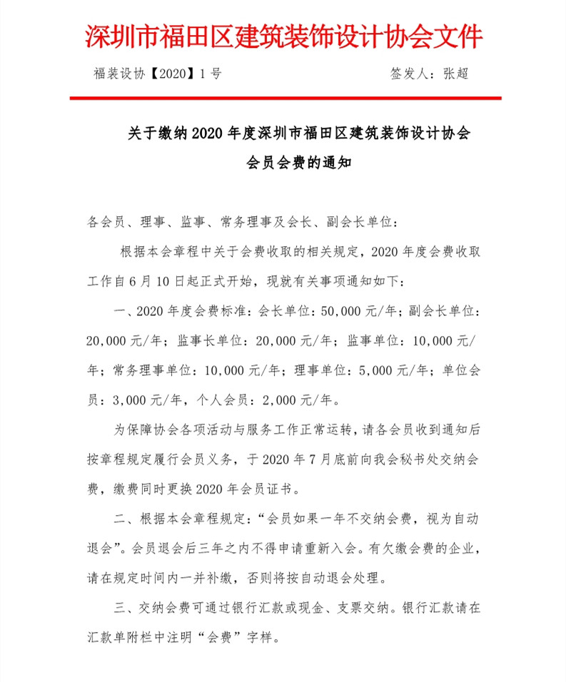 關(guān)于繳納2020年度深圳市福田區(qū)建筑裝飾設(shè)計協(xié)會會員會費的通知