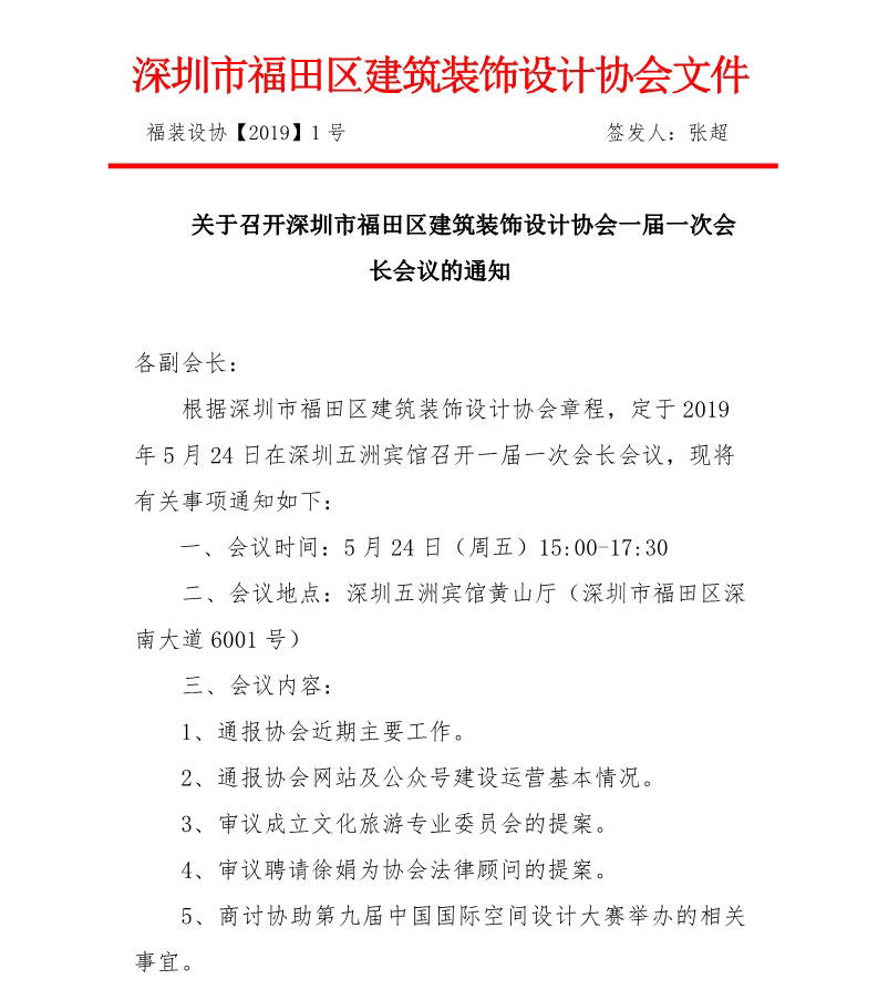 關(guān)于召開深圳市福田區(qū)建筑裝飾設(shè)計協(xié)會一屆一次會長會議的通知