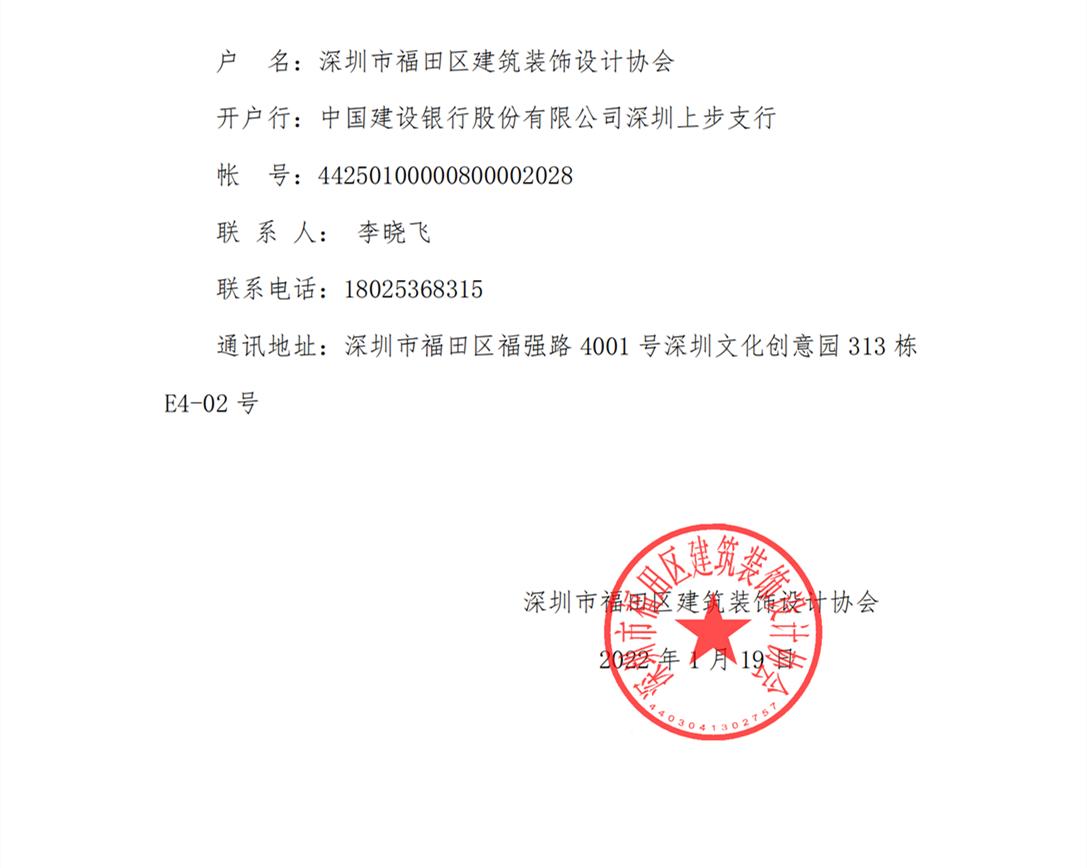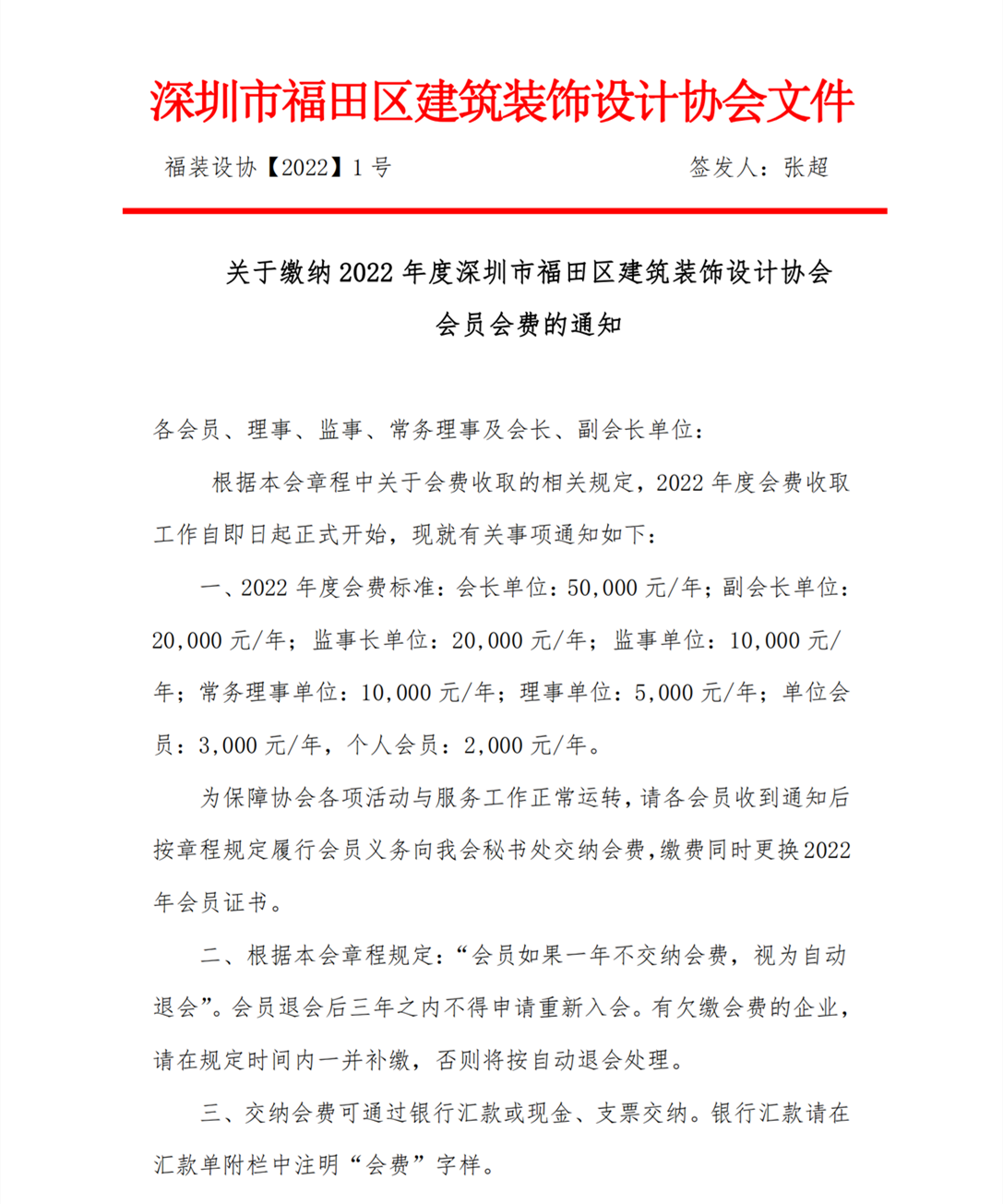 關(guān)于繳納2022年度深圳市福田區(qū)建筑裝飾設(shè)計協(xié)會會員會費(fèi)的通知