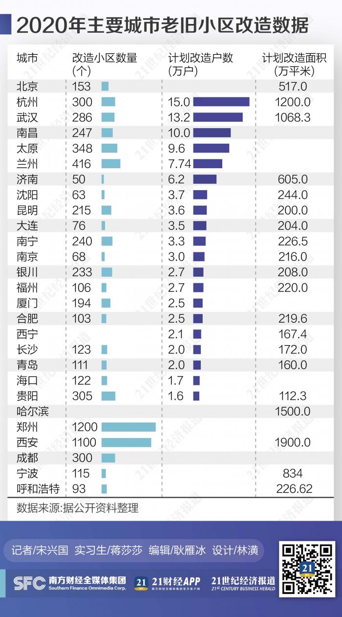在21世紀經濟報道記者統計的城市中,有26個公布了2020年計劃改造的小區數量,其中,鄭州將改造約1200個小區,在所有城市中居首,西安是另一個改造小區數量過千的城市。其他城市公布的數據都沒有超過500個,有18個城市的改造數量都在100至500個之間。