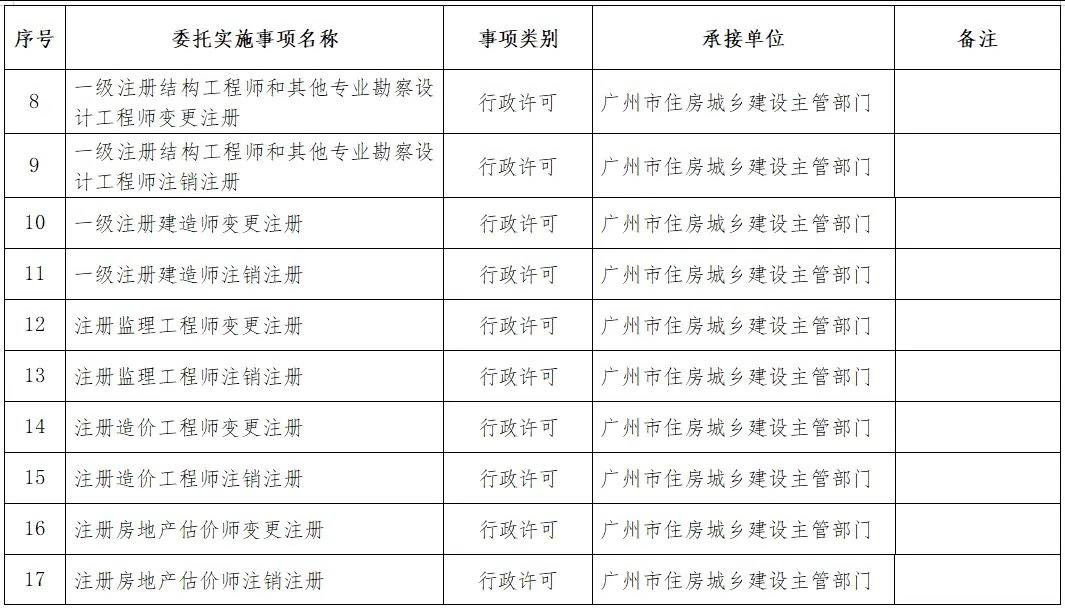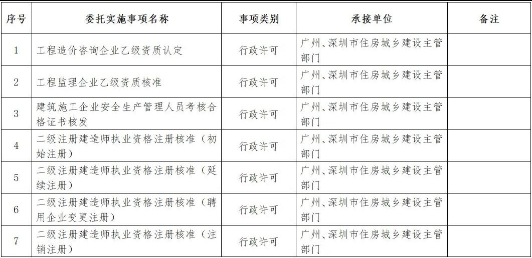 根據《廣東省人民政府關于將一批省級行政職權事項調整由廣州、深圳市實施的決定》(廣東省人民政府令第281號)和《廣東省人民政府關于將一批省級行政職權調整由汕頭華僑經濟文化合作試驗區實施的決定》(廣東省人民政府令第280號),原由我廳實施的工程造價咨詢企業乙級資質認定等23項省級行政職權事項分別委托廣州市、深圳市、汕頭華僑經濟文化合作試驗區實施(具體情況見附表)。