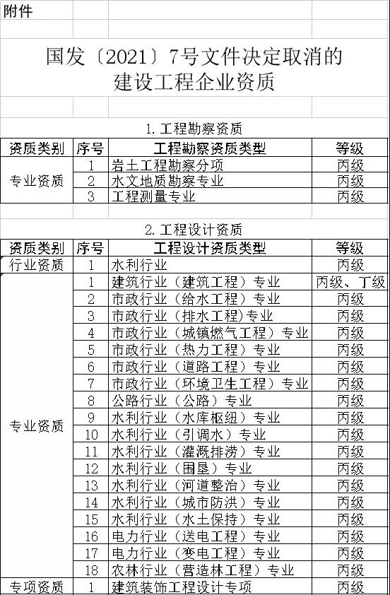 一、按照國發〔2021〕7號文件要求,自2021年7月1日起,各級住房和城鄉建設主管部門停止受理本文附件所列建設工程企業資質的首次、延續、增項和重新核定的申請,重新核定事項含《住房城鄉建設部關于建設工程企業發生重組、合并、分立等情況資質核定有關問題的通知》(建市〔2014〕79號)規定的核定事項。2021年7月1日前已受理的,按照原資質標準進行審批。