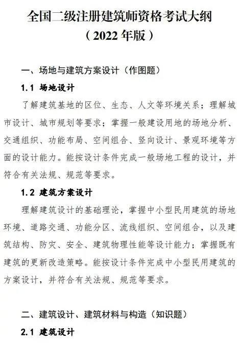 近日,全國注冊建筑師管理委員會對《全國二級注冊建筑師資格考試大綱(2002年版)》進(jìn)行了修訂,形成《全國二級注冊建筑師資格考試大綱(2022年版)》,自2023年度正式實(shí)施。