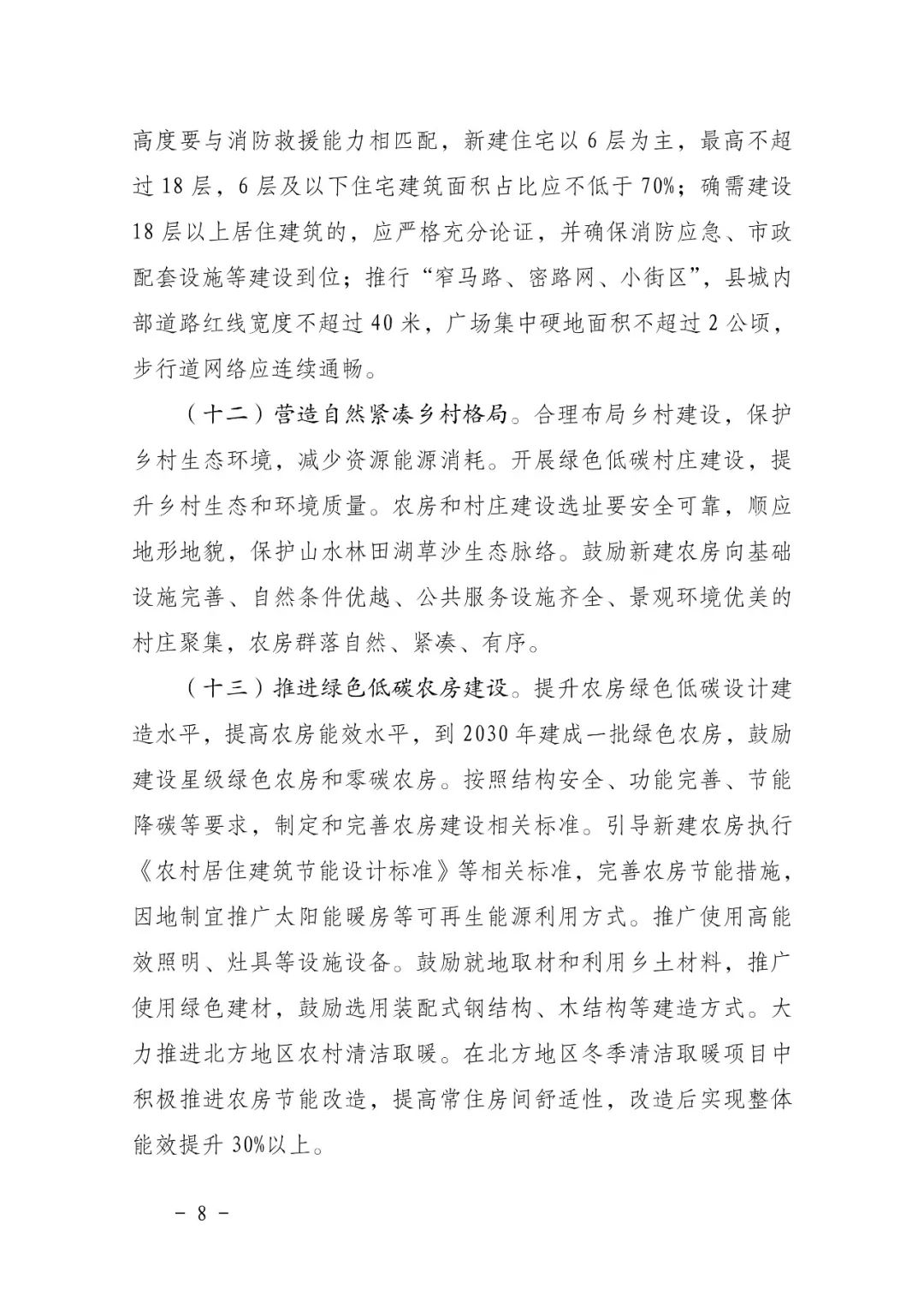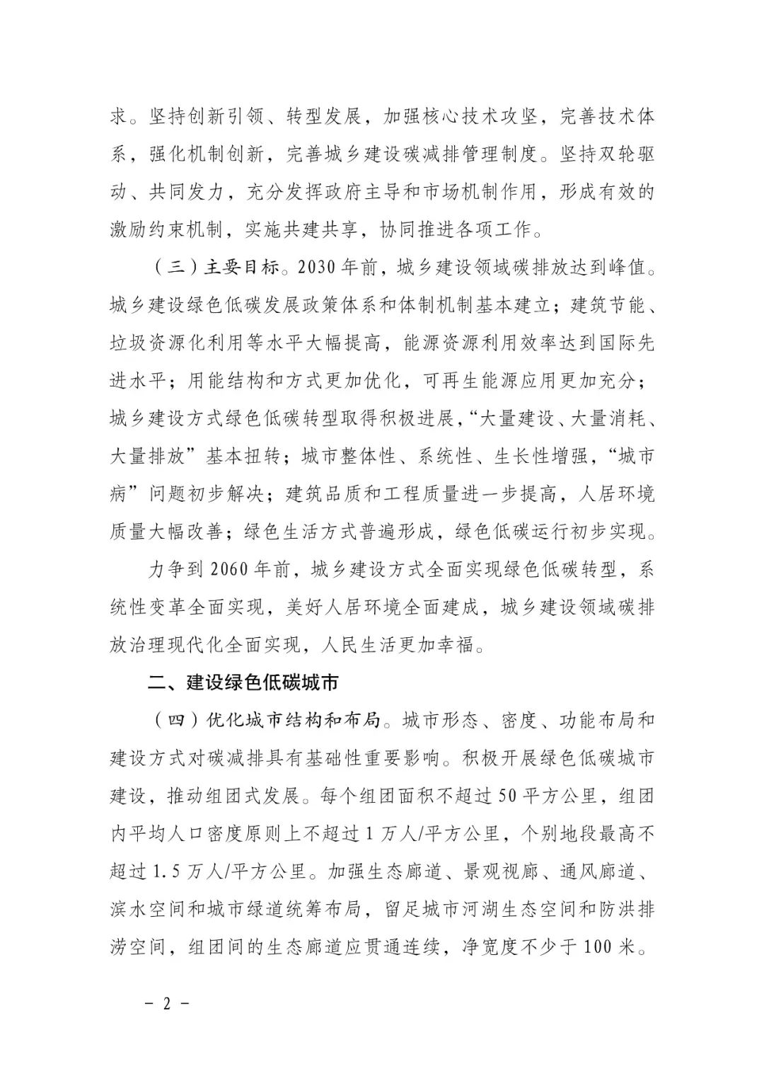 一、優(yōu)化城市結(jié)構(gòu)和布局。城市形態(tài)、密度、功能布局和建設(shè)方式對(duì)碳減排具有基礎(chǔ)性重要影響。積極開展綠色低碳城市建設(shè),推動(dòng)組團(tuán)式發(fā)展。每個(gè)組團(tuán)面積不超過(guò) 50 平方公里,組團(tuán)內(nèi)平均人口密度原則上不超過(guò) 1 萬(wàn)人/平方公里,個(gè)別地段最高不超過(guò) 1.5 萬(wàn)人/平方公里。嚴(yán)格控制新建超高層建筑,一般不得新建超高層住宅。新城新區(qū)合理控制職住比例,促進(jìn)就業(yè)崗位和居住空間均衡融合布局。合理布局城市快速干線交通、生活性集散交通和綠色慢行交通設(shè)施,主城區(qū)道路網(wǎng)密度應(yīng)大于 8 公里/平方公里。嚴(yán)格既有建筑拆除管理,堅(jiān)持從“拆改留”到“留改拆”推動(dòng)城市更新,除違法建筑和經(jīng)專業(yè)機(jī)構(gòu)鑒定為危房且無(wú)修繕保留價(jià)值的建筑外,不大規(guī)模、成片集中拆除現(xiàn)狀建筑,城市更新單元(片區(qū))或項(xiàng)目?jī)?nèi)拆除建筑面積原則上不應(yīng)大于現(xiàn)狀總建筑面積的 20%。盤活存量房屋,減少各類空置房。