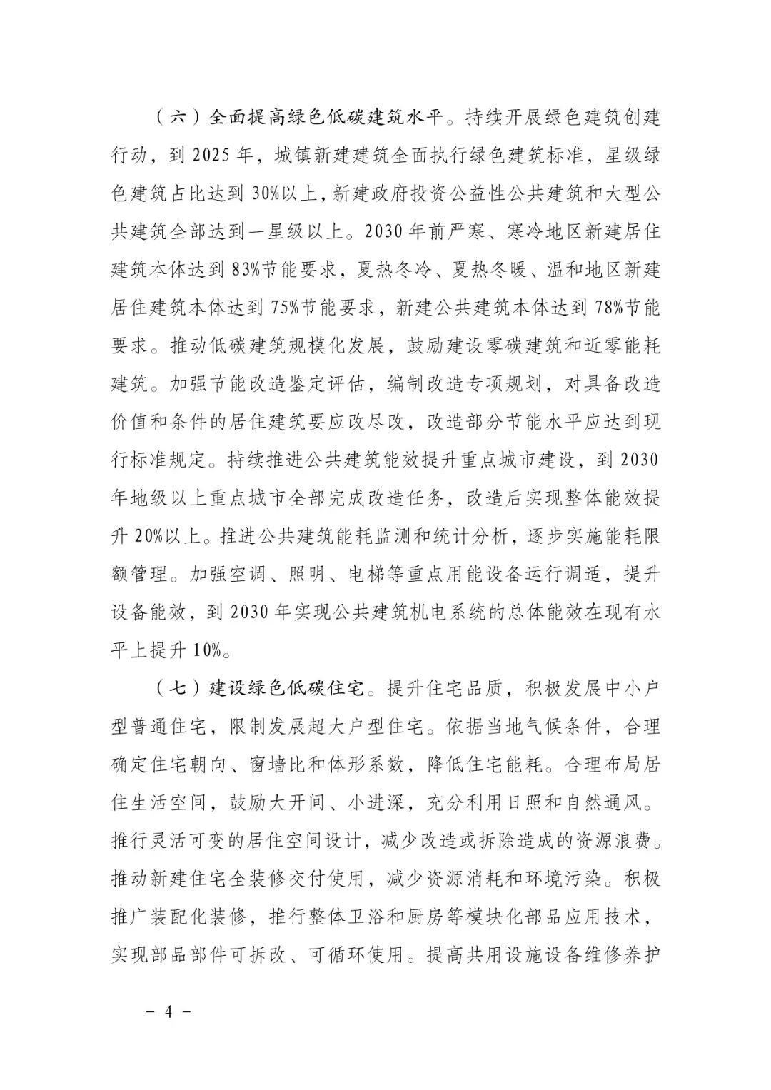 二、全面提高綠色低碳建筑水平。持續(xù)開展綠色建筑創(chuàng)建行動(dòng),到2025年,城鎮(zhèn)新建建筑全面執(zhí)行綠色建筑標(biāo)準(zhǔn),星級(jí)綠色建筑占比達(dá)到 30%以上,新建政府投資公益性公共建筑和大型公共建筑全部達(dá)到一星級(jí)以上。2030 年前嚴(yán)寒、寒冷地區(qū)新建居住建筑本體達(dá)到 83%節(jié)能要求,夏熱冬冷、夏熱冬暖、溫和地區(qū)新建居住建筑本體達(dá)到 75%節(jié)能要求,新建公共建筑本體達(dá)到78%節(jié)能要求。推動(dòng)低碳建筑規(guī)模化發(fā)展,鼓勵(lì)建設(shè)零碳建筑和近零能耗建筑。加強(qiáng)節(jié)能改造鑒定評(píng)估,編制改造專項(xiàng)規(guī)劃,對(duì)具備改造價(jià)值和條件的居住建筑要應(yīng)改盡改,改造部分節(jié)能水平應(yīng)達(dá)到現(xiàn)行標(biāo)準(zhǔn)規(guī)定。持續(xù)推進(jìn)公共建筑能效提升重點(diǎn)城市建設(shè),到2030年地級(jí)以上重點(diǎn)城市全部完成改造任務(wù),改造后實(shí)現(xiàn)整體能效提升20%以上。推進(jìn)公共建筑能耗監(jiān)測(cè)和統(tǒng)計(jì)分析,逐步實(shí)施能耗限額管理。加強(qiáng)空調(diào)、照明、電梯等重點(diǎn)用能設(shè)備運(yùn)行調(diào)適,提升設(shè)備能效,到2030年實(shí)現(xiàn)公共建筑機(jī)電系統(tǒng)的總體能效在現(xiàn)有水平上提升10%。
