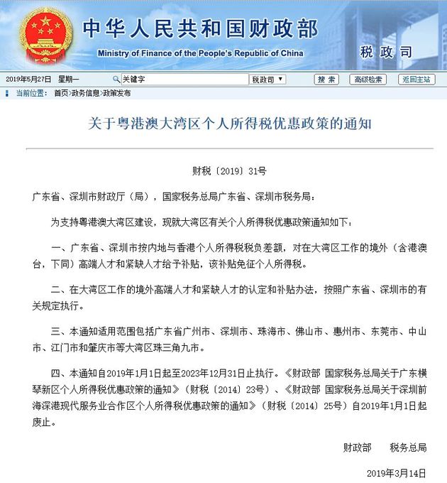 今年3月,財政部、稅務總局聯合印發《關于粵港澳大灣區個人所得稅優惠政策的通知》(下稱《通知》)。其中明確: