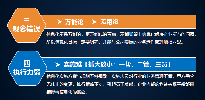 建筑施工企業(yè)信息化產(chǎn)品選型誤區(qū)。很多企業(yè)信息化又想做又害怕,我們總結(jié)了幾方面的問題,規(guī)劃錯誤,缺少頂層設(shè)計造成信息孤島。每一個部門買自己的。我們了解過一個企業(yè)有八套系統(tǒng),都是獨立的,最后作為領(lǐng)導(dǎo)什么數(shù)據(jù)看的都是不一樣的。產(chǎn)品先型不對,越開發(fā)越累,要懂行的才能研究出來,如果找一個軟件,他什么都不懂,能給你研發(fā)出相關(guān)行業(yè)軟件嗎?不行,要選對。萬能論、無用論,軟件不是萬能的,也不是無用的,關(guān)鍵是怎么用。能實施好才是最主要的。對于信息化,不管花幾十萬、幾百萬、幾千萬,要落地,否則就打水漂了。信息化是請老師還是請學(xué)生?