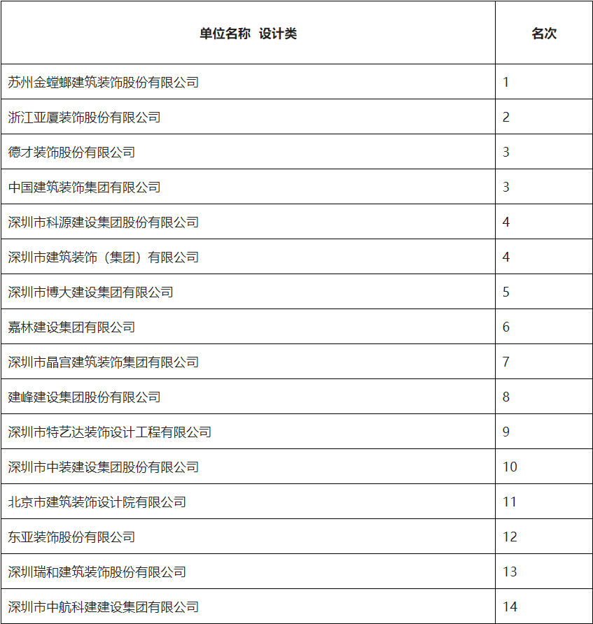 根據中裝協《關于開展2021年度中國建筑裝飾協會行業綜合數據統計工作的通知》(中裝協 [2022]24號文件)及文件中所確定的工作原則和統計規則, 中國建筑裝飾協會組織開展了2021年度中國建筑裝飾行業綜合數據統計工作,此次綜合數據統計工作分為裝飾、幕墻、設計、建材四類,現將2021年度中國建筑裝飾協會行業綜合數據統計設計類結果名單予以公示,公示期7天。