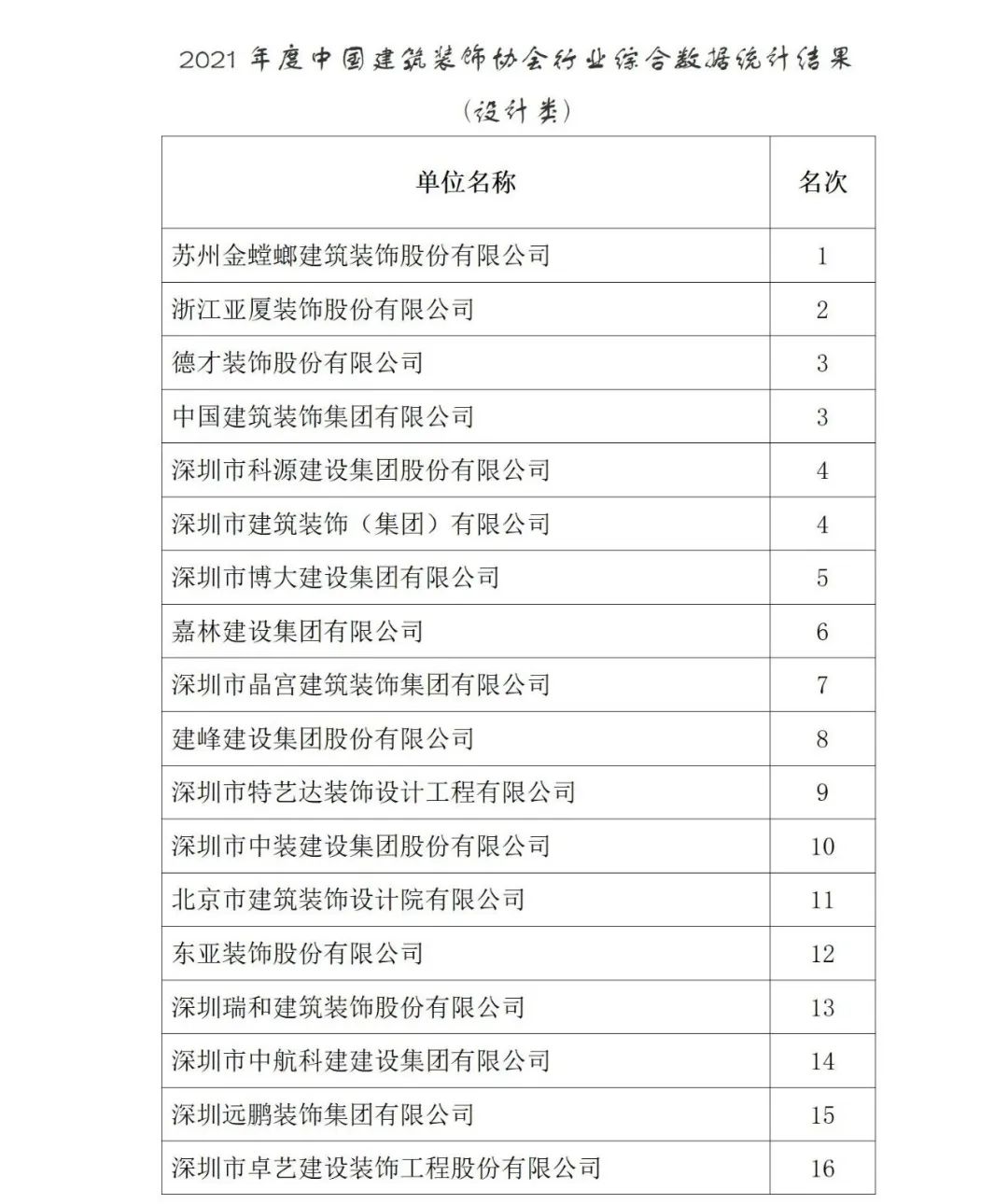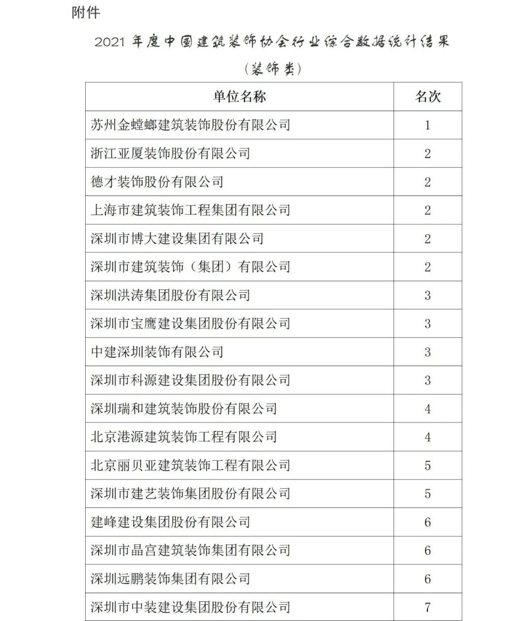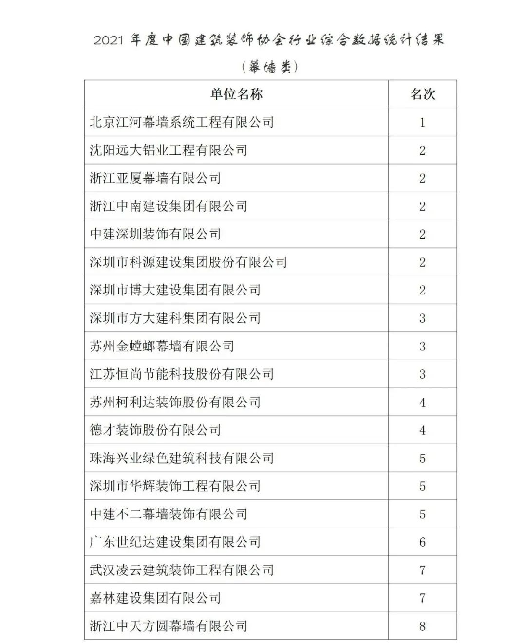 2021年度行業(yè)綜合數(shù)據(jù)統(tǒng)計分為裝飾、幕墻、設計、建材四類,現(xiàn)將2021年度建筑裝飾行業(yè)數(shù)據(jù)統(tǒng)計結果名單予以公告。
