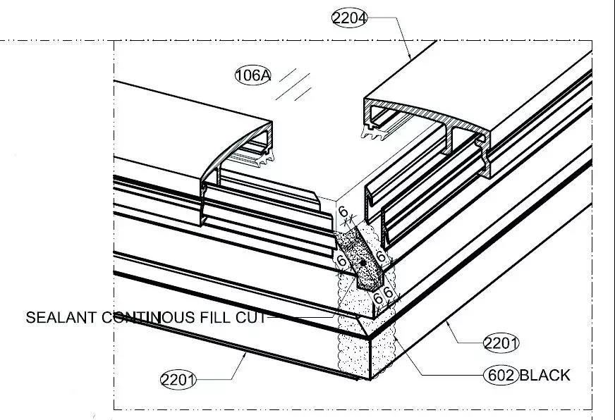 針對層間單元體標準位下節(jié)點,其設(shè)計特點是:可視板塊的安裝在不需要安裝L碼的位置切除一段略大于L碼件的缺口,即圖中藍色標注部位;L碼塞入并滑移到所需要的位置(兩端+中間),兩端L碼起結(jié)構(gòu)支撐,中間L碼為了防止密封片翹曲;卡入帶膠條的通長密封片,密封片之間打密封膠,形成連續(xù)的密封帶。如圖5所示。