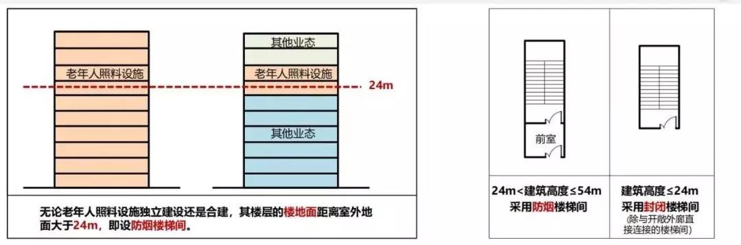 新規范 5.1.1:建筑高度大于24m的獨立建造的老年人照料設施為一類高層民用建筑。