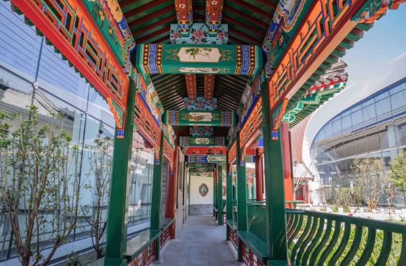 在航站樓五個指廊的盡端,分別設有5個中式風格的室外庭院——中國園、瓷園、田園、絲園、茶園,使室內外空間相互融合,為旅客提供了放松的候機環境和綠色的活動空間。其中,中國園是五個園區中唯一擁有建筑物的園區,八角亭、六角亭、敞軒、榭、廊、殿座、歇山頂、硬山頂、懸山頂……這里幾乎涵蓋了中國傳統古建筑所具有的全部特點。